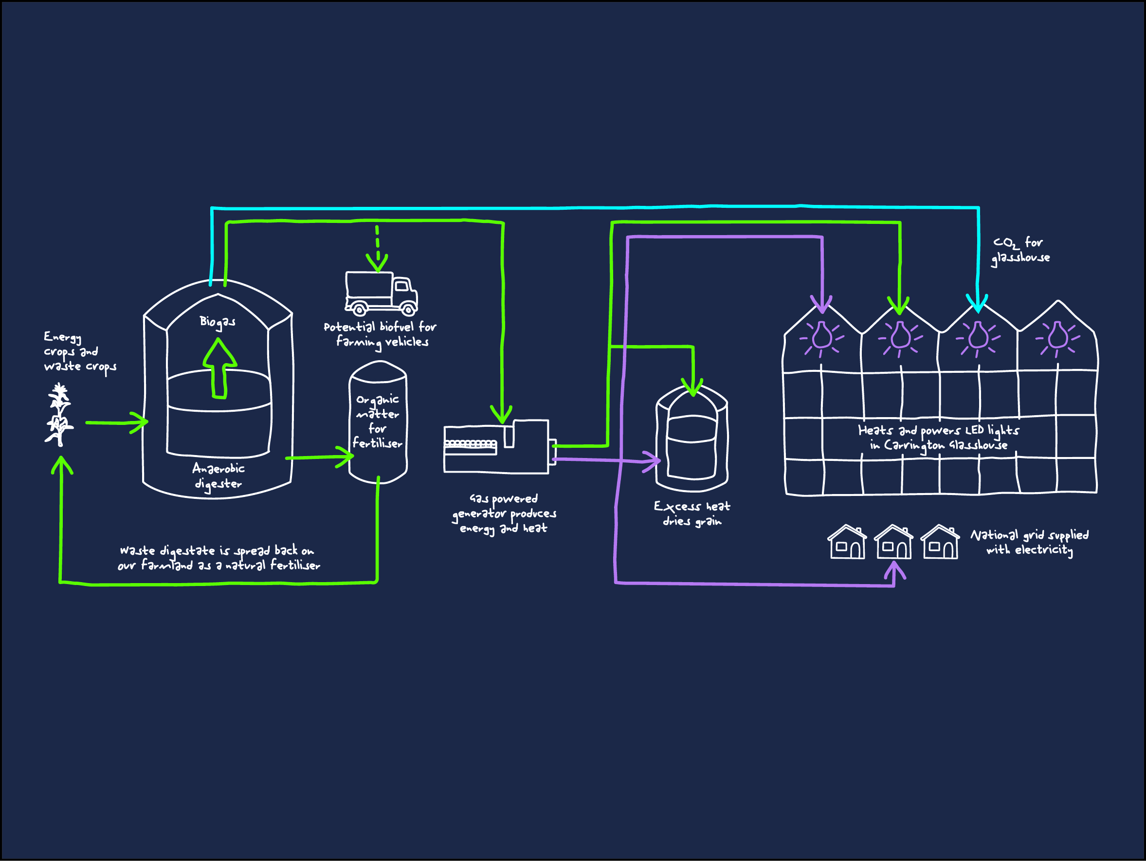Our anaerobic digestion (AD) plant, which is right next door, transforms energy crops, grown on the farm, and waste from the glasshouse into energy. This is delivered to the glasshouse as electricity to power LED lights and heat – key for growing strawberries.