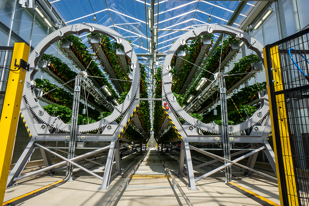 A collaborative effort with Dyson Technology engineers has allowed us to trial vertical growing in the glasshouse. Right at home in our research area, the Hybrid Vertical Growing System (HVGS) delivers 2.5x the growing space in the same footprint, revolutionising UK strawberry farming. Each wheel hosts ten rows and, by slowly rotating, each plant has access to sunlight at periods throughout the day, supplemented by LED lights – perfect for growing out of season strawberries with exceptional quality.
